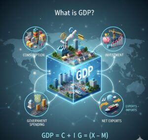 GDP stands for Gross Domestic Product. In simple terms, it is the total value of everything a country produces in a year. In other words, GDP shows how much is produced, how much is spent, and how much is earned in the economy over a period. Think of GDP as a big scorecard for the economy. For example, it counts cars, bread, haircuts, and new school buildings made in the country. It includes all final goods and services produced within a country. In fact, governments calculate GDP each quarter or year to check if the economy is growing or shrinking. Only new production counts: selling a used car or trading stocks does not add to GDP.